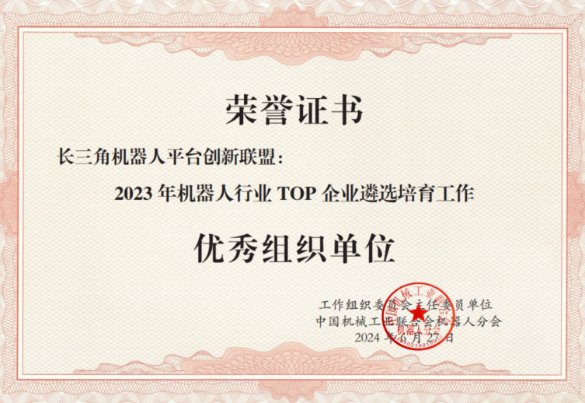 牵头发起的长三角机器人产业平台创新联盟获中国机械工业联合会机器人分会“机器人行业TOP企业遴选培育工作优秀组织单位”奖。