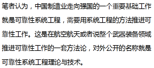 透过国外工业化发展的历史和中外三个阶段的对比——生产过程、研制过程和全系统全寿命的管理,可以看出可靠性系统工程的诞生背景。实际上,这些完全对应了钱老提出来的“可靠性是设计出来的、生产出来的、管理出来的”。 中国制造要从大国走向强国之路,企业必须狠抓质量和可靠性。而系统工程抓可靠性管理是唯一的可行之路。